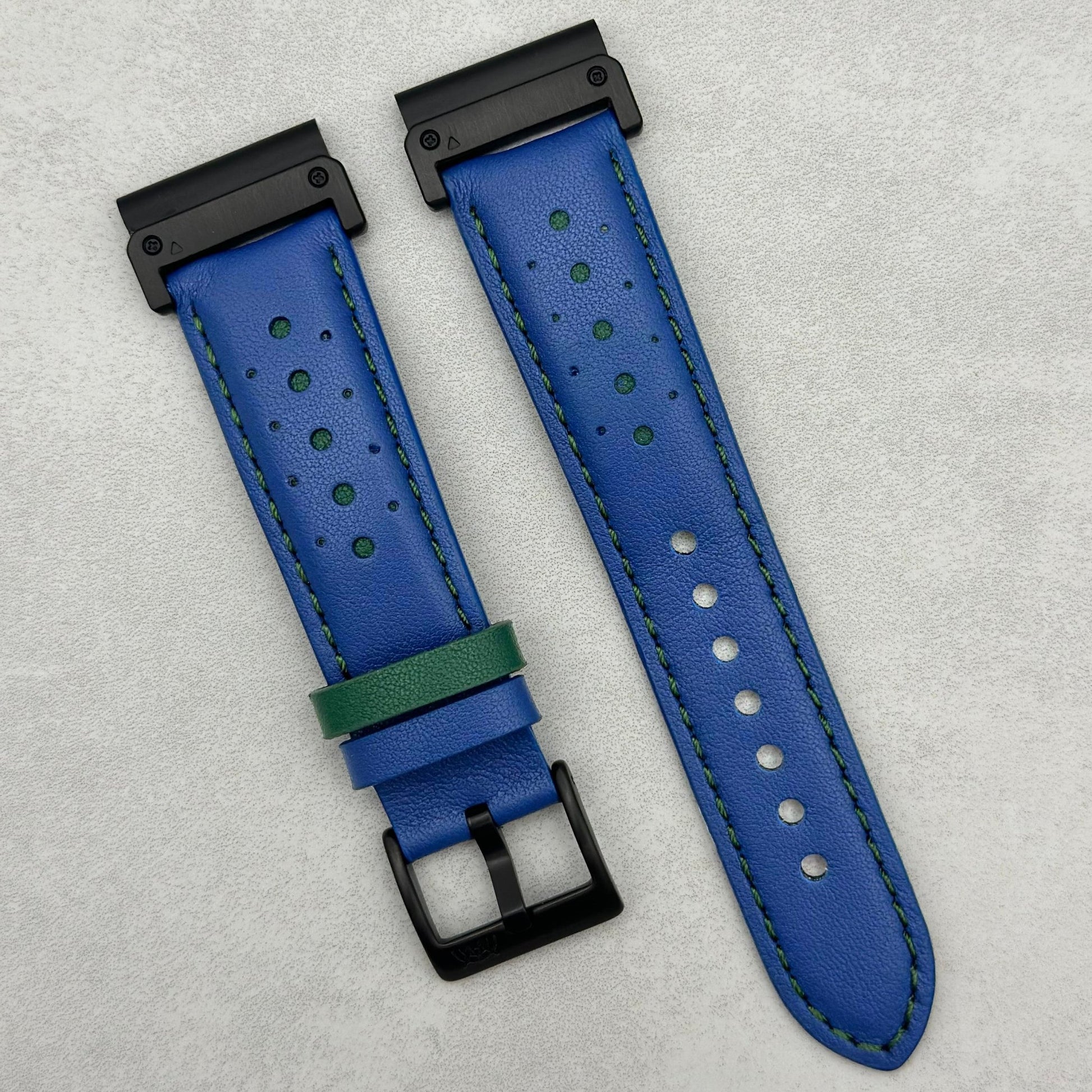 Le Mans: Cobalt Blue and Green Leather Padded Racing Garmin QuickFit Watch Strap