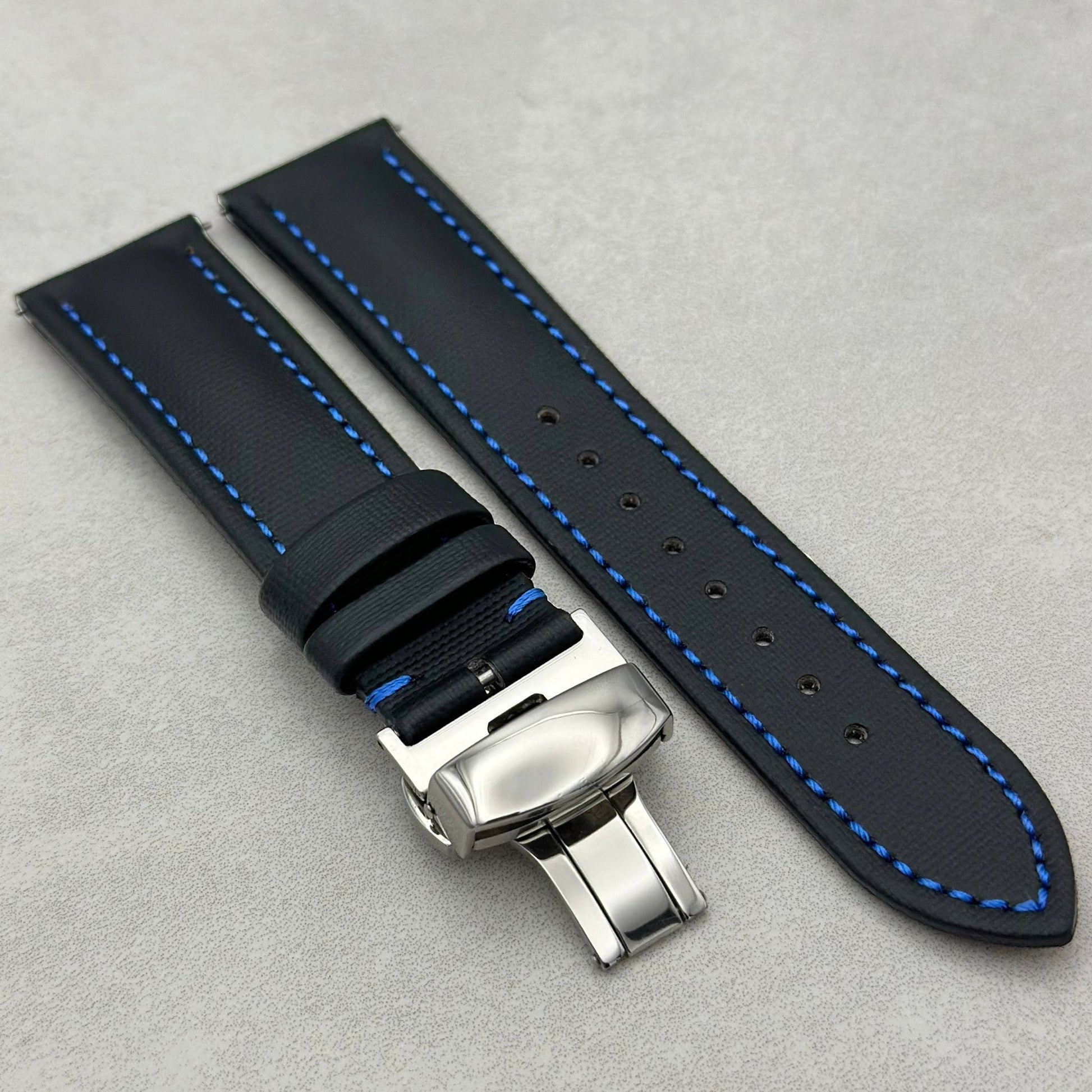 The Bermuda: Jet Black Sail Cloth Watch Strap With Contrast Blue Stitching