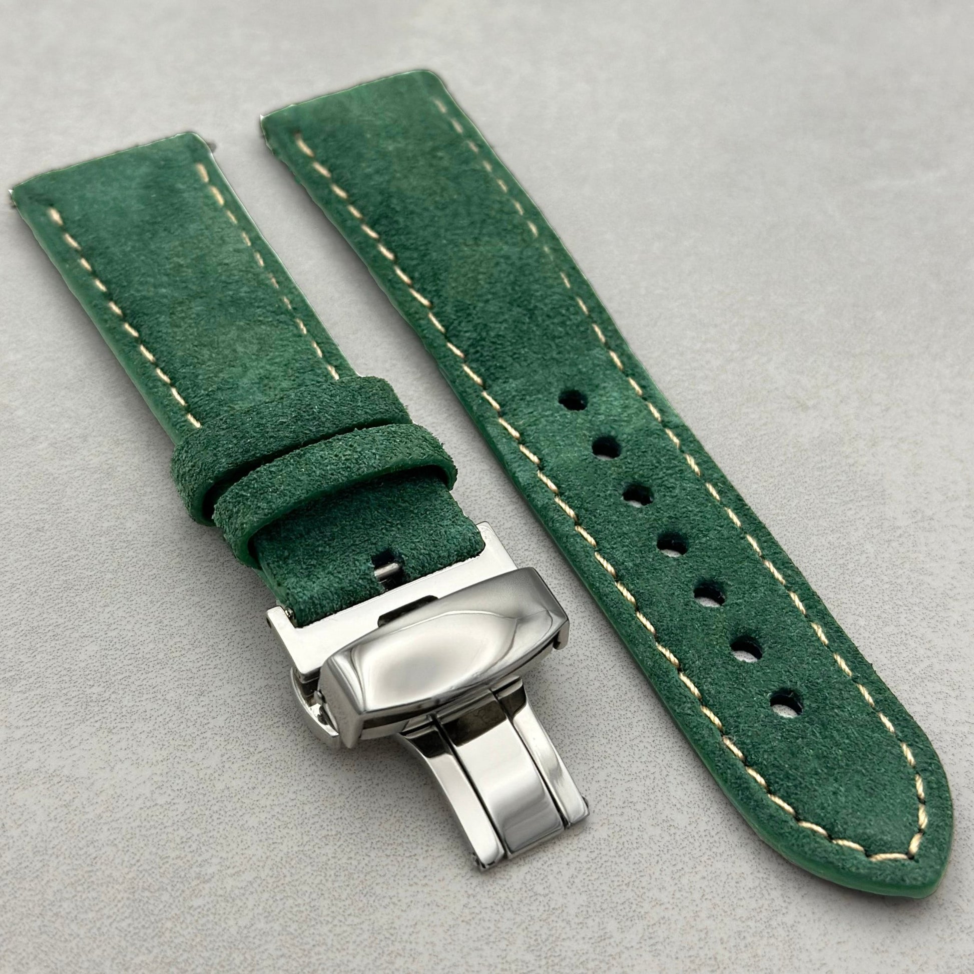 Our Paris collection, the sensuous luxury of soft suede. Also, added and leather backed to provide a practical watch band for everyday use. Our handcrafted hunter green suede watch strap also incorporates quick release pins for easy, secure change of watch band.