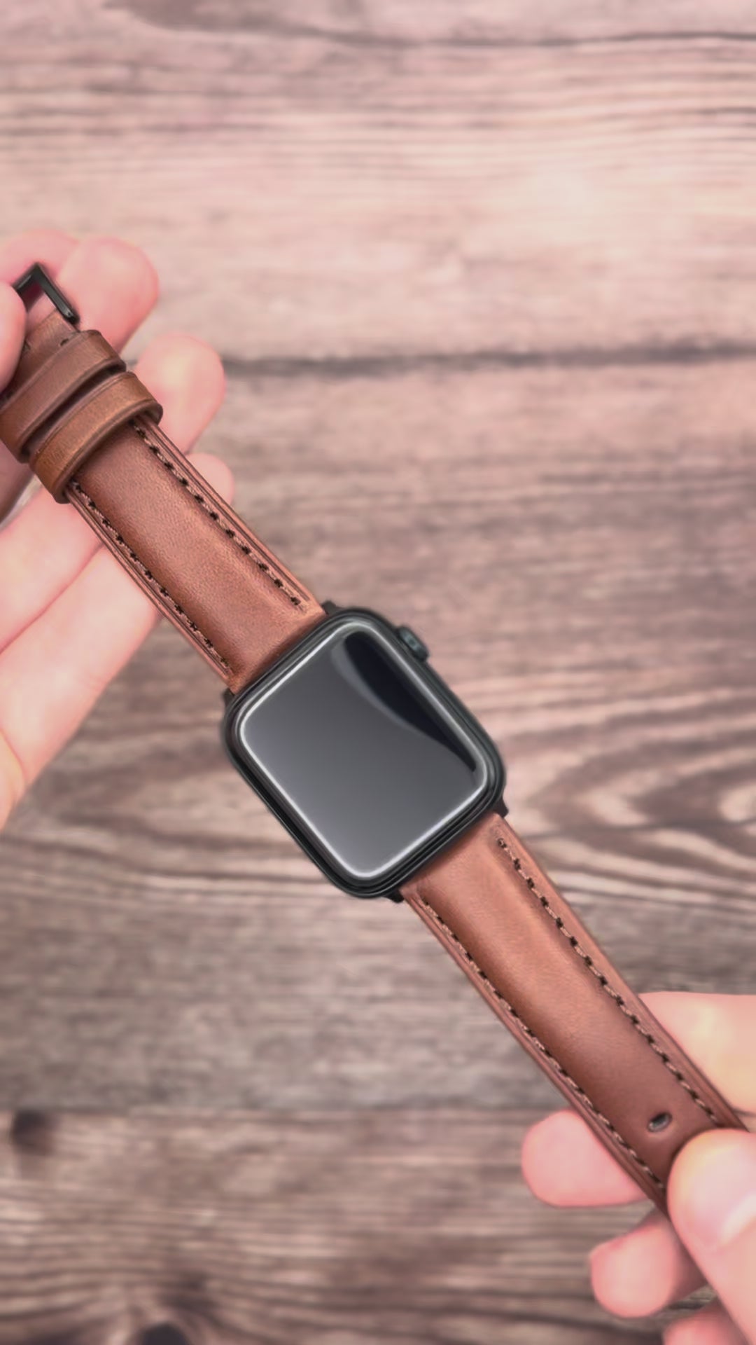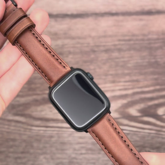 The Prague, the appearance of age with the quality and comfort of new. A chestnut brown full grain leather apple watch strap constructed from hand dyed vegetable tanned leather.